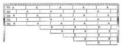 도 14a ~ d는, 거울-역상 연결 시스템의 A판과 B판을 사용하여 평행한 열로서의 합리적인 설치를 도시한다. 도 14a에 따르면, 예를 들어 A판을 사용한 열(R1 ~ R5)이 먼저 설치된다. 그 다음, 이동이 이루어지고 남은 A판이 도 14b에 따라서 설치된다. 다음 단계로, B판이 설치되고 이동된 후 남은 B판이 설치된다. 이러한 10열의 설치는 오직 2번의 움직임으로 이루어질 수 있다. 이러한 예시적인 방법은 앞선 열(R5)의 마지막으로 놓인 A판에 연결되는 새로운 열(R6)의 최초의 B판으로 특징지어진다. 따라서 본 발명은 평행한 열로서 연결되는 거울-역상의 연결 시스템을 구비한 두 가지 형식의 A판과 B판으로 이루어진 마루를 포함한다.14a-d show a rational installation as parallel rows using A and B plates of a mirror-inverse connection system. According to Fig. 14A, for example, rows R1 to R5 using the A plate are first installed. Then, the movement is made and the remaining A plate is installed according to Fig. 14B. In the next step, the B board is installed after the B board is installed and moved. This ten-row installation can only be done in two moves. This exemplary method is characterized by the first B plate of a new row R6 which is connected to the last placed A plate of the preceding row R5. The present invention therefore comprises a floor consisting of two types of A and B plates with mirror-inverted connection systems connected in parallel rows.