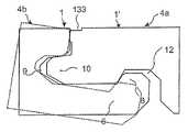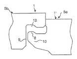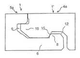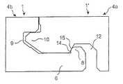 도 3c의 다음 열은 (6, 7, 및 8)로 도시된 A판은 긴 면을 따라 안쪽으로 구부러짐에 따라 연결된다.  짧은 면(5b)에서는 짧은 면이 긴 면에 대해 하방으로 구부러지는 것을 예방하도록 어떠한 형식의 텅도 없기 때문에, 판(7 및 8)은 이러한 방식으로 연결될 수 있다.  최종적으로 도 3e는, 판(9, 10)들이 안쪽으로 구부러짐에 따라 어떻게 놓일 수 있는지를 도시한다.  따라서 이러한 놓이는 방법은 안쪽으로 구부림으로써 전체 마루가 헤링본 패턴으로 놓일 수 있다는 것을 특징으로 한다.  짧은 면에 대해 놓이는 긴 면은 대안적으로 수직 및 수평으로 판과 결합한다.  이러한 놓이는 방법으로 모든 짧은 면들은 예를 들어 텅의 형태인 수직 결합 수단을 갖고 있지 않지만 수평 및 수직으로 결합될 수 있다.  놓이는 것은, 예를 들어 판(A6)과 판(A7)인 동일한 형식의 2개의 판이 B판(9)이 안쪽으로 구부러질 수 있기 전에 반드시 놓여야 함을 특징으로 한다.  본 발명의 범위에서, 도 2b에 따른 결합 시스템은 수직 결합 수단(10')으로 제공될 수 있으며, 이는 도 12b에서 강조선과 같이 스내핑 효과로서 수직 이동을 허용한다.  그러나 이로 인해서 마루의 기능에 대한 중요성이 제한되고 설치는 보다 어려워지지만 이러한 연결 시스템은 마루판이 평행한 열로 놓일 때 짧은 면에 대해 보다 많은 강도를 제공할 수 있다.The next row of Fig. 3C is shown as (6, 7, and 8) A plates are connected as they bend inward along the long side. The