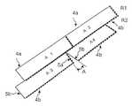 또한, 헤링본 패턴으로 놓이는데 적합한 마루판은 연결 시스템이 편리한 방법으로 디자인된다면 평행한 열로 놓일 수 있다.  이는, 보다 많은 패턴들이 동일한 형식의 마루판에 제공될 수 있으며 제조품 및 재고품을 이용한다는 점에서 바람직하다.  도 4a 및 도 4b는, 긴 면(4a 및 4b)을 따라 각운동(A)에 의해 새로운 열 (R2)의 새로운 마루판(A4)이 선행된 열(R1)의 미리 놓인 마루판(A2)에 어떻게 연결되는지를 도시한다.  그루브면(5b)을 구비한 새로운 판(A4)의 짧은 면은 미리 놓인 판(A3)의 짧은 면을 걸쳐서 그리고 결합면(5a)을 걸쳐서 수직 하방으로 접힌다.  후속적인 열(R3)에 후속적으로 놓일 판(A5)이 마루판(A3, A4)과 연결될 때, 선행한 열(R1) 및 후속적인 열(R3)의 긴 면은 짧은 면(5a 및 5b)을 결합하고 그루브면(5b)이 상방으로 구부러지는 것을 방지할 것이다.  그 다음 짧은 면이 수직 및 수평으로 연결된다.  판들은 반대 순서로 제거될 수 있다.  이러한 놓임 방법에서 결합면(5a)의 텅 그루브(9)는 작동되지 않지만 긴 면(4a)에 연결하는데 필요하다.  따라서 연결이 평행한 열에서 이루어진다면 텅 그루브(9a)는 반드시 필요하지 않다.  예를 들어 60도의 결합 각도 는 긴 면에서 높은 강도를 제공하는데 충분한 것이 일반적이다.  이러한 각도는 안쪽으로 구부러지는 것을 가능하게 한다.  특히 예를 들어 60 ~ 120mm의 너비인 좁은 판에서는 짧은 면에서의 이에 상응하는 각도가 불충분한 강도를 줄 수 있다.  결합 각도가 작을 때, 긴 면은 동일 평면의 짧은 면을 함께 유지하는데 적절하지 않다.  이는, 스내핑이 빠지거나(snapping-out) 바람직하지 않은 연결 갭을 야기한다.  짧은 면에서의 놓은 결합 각도는, 판이 서브-마루에 대해 수직 이동으로 놓을 때 어떠한 결함을 주지 않는다.In addition, floorboards suitable for laying in a herringbone pattern can be laid in parallel rows if the connection system is designed in a convenient way. This is desirable in that more patterns can be provided on the same type of floorboards and use manufactured goods and inventory. 4a and 4b show how a new floorboard A4 of a new row R2 is preceded by a angular motion A along the