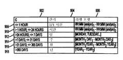 또 다른 실시예에서, 카테고라이저는 종점 기반 알고리즘(endpoint-based algorithm)을 사용하여 순서화 간격을 결정할 수 있다.  도 9는 타임라인 종점(들)에 기초하여 순서화 간격 및 라벨 포맷을 결정하기 위해 예시적 실시예의 알고리즘에 의해 사용될 수 있는 도표를 도시한다.  칼럼(902)은 분석되는 타임라인이 커버하는 시간 범위를 나타낸다.  칼럼(904)은 타임라인(500)이 칼럼(902)에서 특정된 범위 내에 속할 경우 카테고라이저가 선택하는 간격을 제공한다.  칼럼(906)은 선택된 간격에 기초하여 초점 그룹 헤더에 적용될 수 있는 라벨을 나타낸다.  여기에서 제공된 예는 순서화 특성으로서 시간을 이용하지만, 파일 종류, 파일 이름, 파일 소유자, 문서 저자, 또는 순서화될 수 있는 임의의 다른 파일 특성과 같은 다른 순서화 특성들에 대하여 유사한 알고리즘이 적용될 수도 있다는 것을 숙련된 당업자라면 알 수 있다.  예로서, 칼럼들(902, 904, 906) 아래에 6개의 행(row)이 제시되어 있다.  타임라인이 1 시간 미만을 커버하는 제1 행(908)에서는, 카테고라이저는 1/4 시간(quarter hours)으로 순서화 간격을 설정할 수 있고, 제1 시간/분 조합 및 제2 시간/분 조합으로서 시간 범위를 나타내는 라벨 포맷을 설정할 수 있다.  타임라인이 1 시간 이상 24 시간 미만을 커버하는 제2 행(910)에서는, 카테고라이저는 시간으로 간격을 설정할 수 있고 제1 행(908)에서와 유사한 시간/분 조합으로 라벨 포맷을 설정할 수 있다.  제3 행(912)은 타임라인(500)이 24 시간 이상 7일 이하를 커버할 때 적용될 수 있다.  이 경우, 카테고라이저는 일(days)로 간격을 설정할 수 있고 라벨 포맷은 어떤 시간 범위가 아니라 일주일 중의 하루일 수 있고  초점 그룹 헤딩의 중앙에 배치될 수 있다.  행들(914, 916, 918)은 각각 보다 긴 타임라인을 제공하고, 각각에 대해 적용되어야 하는 간격 및 라벨을 기술한다.  일단 카테고라이저가 그룹들을 나누면(예컨대, 적당한 시간 간격을 선택하면), 그 후 그 그룹들은 사용자에게 디스플레이될 수 있다.In yet another embodiment, the categorizer can determine the ordering interval using an endpoint-based algorithm. 9 shows a diagram that may be used by the algorithm of the example embodiment to determine the ordering interval and label format based on the timeline endpoint (s).