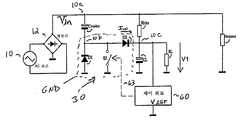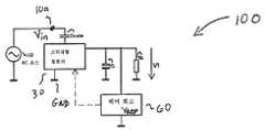 예시 응용에서, 스위치 모드 전력 공급기 내에서 보조 전력의 생성은 다음의 방식으로 이루어질 수 있다.  이제, 도 2와 관련하여 주기 입력 전압 Vin의 소스는 정류기(12)에 연결된 AC 소스(10)로부터 노드(10a)로 진행되어 있다.  필터 커패시터(Cmains)의 제1 단자는 노드(10a)에 연결되어 있고, 제2 단자는 노드(10b)에 연결되어 있다.  다이오드(D1)은 노드(10b)와 접지(GND) 사이에 역-바이어스 형태로 연결되어 있다.  필터 커패시터(Cmains)는 다이오드(D2)를 통해서 커패시터(CL)과  연결되어 전압분배기 배치를 갖는다.  커패시터(CL)의 제1 단자는 노드(10c)에서 다이오드(D2)의 음극과 연결되어 있고, 제2 단자는 접지되어 있다.  스위치(S1)은 노드(10b)와 접지 사이에 다이오드(D1)과 병렬로 연결되어 있다.  제어 회로(60)는 노드(10c)에서 부하 저항(RL) 및 커패시터(CL)과 병렬로 연결되어 있다.  바이어스 저항(Rbias)는 노드(10a)와 노드(10c) 사이에 연결되어 있다.  다이오드(D2)가 순방향으로 바이어스된 경우(즉, 전도), 노드(10b)와 노드(10c)는 다이오드(D2) 양단의 상대적으로 소량의 전압 강하를 제외하면 실질적으로 동일한 전위인 것을 주목한다.  저항(Rbias)는 상대적으로 큰 값을 가져서, 일반적으로 사용되는 기본 제어기 IC에 대해 시동 전압(start up voltage)(V1)을 전달한다.  저항(Rmains)는 주요 부하 저항을 나타내며, 입력 노드(10a) 및 GND 사이에 연결되어 있다.In an example application, the generation of auxiliary power in a switch mode power supply can be made in the following manner. Referring now to FIG. 2, the source of the periodic input voltage Vin is advanced from