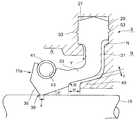 키부(29)의 최상부는 축방향 두께의 중심(T)을 정점으로서 반경방향 외측에 산 형상으로 형성되어 있다.  예를 들면, 양측으로 균등하게 대략 15도의 경사각을 가지고 있다.  이와 같이, 균등인 산 형상으로 하는 것으로, 키부(29)를 케이싱(9) 내의 환상 홈(27) 내에, 밀어 넣어 사이에 둘 때에, 고무는 압축되어, 산 형상의 최상부는, 양방향으로 밀리게 되므로, 즉 2방향으로 압축률의 공간이 있는 것으로, 키부(29)의 환상 홈(27) 내의 중심 위치가 스스로 정해져서, 키부(29)의 감합 상태가 안정된다.