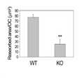 정상 및 CK-B 결손 마우스의 골수유래 대식세포에 30 ng/ml의 M-CSF 및 100 ng/ml의 RANKL을 6 일간 처리하여 분화시킨 후 TRAP 염색하여 다핵성 파골세포의 수를 측정하였다. 흡수 정도는 toluidine blue 염색 후 흡수된 면적을 측정하여 파골세포당 흡수 면적으로 표시하였다. **P < 0.01 정상 파골세포에 비교한 CK-B 결손 파골세포의 유의성.Bone marrow-derived macrophages of normal and CK-B deficient mice were treated with 30 ng / ml M-CSF and 100 ng / ml RANKL for 6 days to differentiate, followed by TRAP staining to determine the number of multinuclear osteoclasts. The degree of absorption was measured by the area absorbed after toluidine blue staining and expressed as the absorption area per osteoclast. ** Significance of CK-B deficient osteoclasts compared toP <0.01 normal osteoclasts.