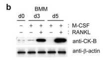 Creatine kinase(CK)은 크레아틴 인산으로부터 고에너지 인산기를 ADP로 전이하는 반응을 촉매하는 효소로 CK의 isoenzyme은 CK-BB(EP상에서 albumin위치로 이동하고 주로 뇌에 존재), CK-MM(EP상에서 globulin 영역으로 이동하며 주로 골격근에 존재), CK-MB(양자의 hybrid형으로 EP에서 2-globulin 위치로 이동하며 주로 심근에 존재)가 있다. 본 발명에서의 용어 "CK-B"는 CK-BB를 의미한다. 이하 도 1a에서 보는 바와 같이 파골세포의 분화 및 활성화 과정에서 발현양이 증가한다. 또한, CK-B는 RhoA 및 V-ATPase 활성 및 세포 내 골격을 이루는 actin ring 조절에 관여한다.Creatine kinase (CK) is an enzyme that catalyzes the transfer of high-energy phosphate groups from creatine phosphate to ADP. The isoenzyme of CK is CK-BB (moves from EP to albumin and is present in the brain) It moves to the globulin region and is mainly in skeletal muscle) and CK-MB (hybrid hybrid type is moved from EP to 2-globulin position and is mainly in the myocardium). The term "CK-B" in the present invention means CK-BB. Hereinafter, as shown in Figure 1a, the amount of expression increases during the differentiation and activation of osteoclasts. In addition, CK-B is involved in RhoA and V-ATPase activity and actin ring regulation that forms the intracellular framework.