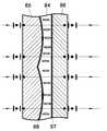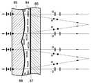 도 1a 및 도 1b는 이러한 종래의 렌티큘러 수단(83)에 무편광 광이 입사할 경우의 동작을 설명하는 단면도이다. 일반적으로 액정 물질에 입사하는 무편광 광은 두 개의 광선, 즉, 서로 수직한 방향으로 편광된 정상광선(ordinary ray)과 이상광선(extraordinary ray)으로 분해되어 나타난다. 도 1a 및 도 1b에서 수직 라인이 표시된 선은 정상광선을 나타내며, 도트가 표시된 선은 이상광선을 나타낸다. 한편, 전기장이 존재하지 않는 경우, 도 1a에 도시된 바와 같이, 전기-광학 매질 (84)의 분자들은 기판(86)에 평행하게 정렬되어 있다. 여기서, 렌티큘러 렌즈시트(85)는 상기 전기-광학 매질(84)의 정상광선에 대한 굴절률과 동일한 굴절률을 갖는 재료를 사용하며, 상기 전기-광학 매질(84)은 이상광선에 대한 굴절률이 정상광선에 대한 굴절률 보다 낮은 것이 선택된다. 따라서, 두 전극(88,87)에 전압이 인가되지 않는 경우, 상기 렌티큘러 렌즈시트(85)가 정상광선에 대해서 렌즈로서 작용하지 못하기 때문에, 도 1a에 도시된 바와 같이, 정상광선은 굴절되지 않고 그대로 렌티큘러 수단(83)을 통과한다. 반면, 이상광선은 상기 렌티큘러 렌즈시트(85)에 의해 굴절되면서 좌안용 영상과 우안용 영상으로 시역분리가 일어나게 된다.1A and 1B are cross-sectional views illustrating the operation when unpolarized light is incident on the conventional lenticular means 83. In general, unpolarized light incident on the liquid crystal material is decomposed into two rays, that is, normal rays and extraordinary rays polarized in directions perpendicular to each other. In FIG. 1A and FIG. 1B, the line marked with the vertical line represents the normal light, and the line marked with the dot represents the abnormal light. On the other hand, in the absence of an electric field, as shown in FIG. 1A, the molecules of the electro-