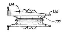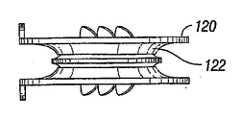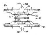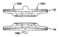 또 다른 실시예에서, 타원 모양의 수핵 대신에, 구형 혹은 타원형 단부 섹션과 평탄화된 혹은 원통형 중심 섹션을 구비하는 가늘고 긴 혹은 "소시지 타입"의 형상을 사용할 수 있다. 이러한 형상의 수핵이 상측 단부 플레이트 상의 원통형 지지면과 합치될 때, 굴절 및 확장뿐만 아니라 측방향의 굴절 동안 면 접촉 및 선 접촉 양자가 제공된다. 이러한 타입의 가늘고 긴 수핵이 사용될 때, 정상 운동의 한계를 넘으면 정지부에 의해 정지되는 축방향 회전을 허용하는 하측 단부 플레이트 내의 대응하는 단부 플레이트 골이 제공된다. 이러한 골은 "나비넥타이", "강아지 뼈" 등의 형성을 지닐 수 있다. 상기 골은 한정된 전방/후방 및 중간/측방향 병진 운동을 허용하기 위해 수핵에 비해 약간 과도한 크기로 될 수 있다. 추가적으로, 단부 플레이트의 골 지지면은 수핵의 움직임의 외측 한계에서 상향으로 굴곡될 수 있다. 이러한 특징은 수핵이 회전할 때 수핵의 상향 상승을 강제하고, 또 인접한 척추체들이 이격되도록 강제하여 그들 사이의 조직에 하중을 가해 운동의 점진적인 정지를 초래하는 장치의 축방향 신연을 유발한다. 골 내부에서 코어의 병진 운동은 자연 그대로의 디스크의 가변 동시 회전축을 보존하려고 시도한다.In another embodiment, instead of an elliptic nucleus, one may use an elongated or “sausage type” shape having a spherical or elliptical end section and a flattened or cylindrical center section. When the nucleus of this shape coincides with the cylindrical support surface on the upper end plate, both face contact and line contact are provided during lateral deflection as well as deflection and expansion. When this type of elongated nucleus pulposus is used, a corresponding end plate trough in the lower end plate is provided that allows axial rotation to be stopped by the stop once it exceeds the limits of normal motion. Such bone may have the formation of a "butterfly", "dog bone", and the like. The bone may be slightly oversized relative to the nucleus pulposus to allow for limited forward / rear and intermediate / lateral translational movement. Additionally, the bone support surface of the end plate may be curved upward at the outer limit of the movement of the nucleus pulposus. This feature forces the upward elevation of the nucleus when the nucleus nucleus rotates, and forces adjacent vertebral bodies to be spaced apart, loading the tissue between them, causing axial distraction of the device resulting in a gradual stop of motion. The translational motion of the core inside the bone attempts to preserve the variable simultaneous rotational axis of the disk as it is.