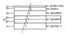 상기 베이스 기판(21)의 굴절율은 1.53이고 두께는 7*06[Å]이고, 상기 하부 절연막(24)의 굴절율은 1.85이고 두께는 4600[Å]이고, 상기 유기 절연막(25)의 굴절율은 1.56이고 두께는 34000[Å]이고, 상기 화소 전극(26)의 굴절율은 2.0이고  두께는 550[Å]이고, 상기 배향막(27)의 굴절율은 1.6이고 두께는 900[Å] 내지 1100[Å]이다.The