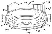 따라서, 용기(10)의 베이스(20)의 반전 링(42)의 얇고, 유연하고, 곡선의, 전체적으로 "S"자 형상의 기하구조는 실질적으로 평평한 베이스를 갖는 용기에 비하여 더 큰 부피 변화를 갖도록 허용한다.  도 1 내지 6은 중앙부(36)의 투영 면적을 증가시키고 그럼으로써 진공 관련된 힘에 반응하는 능력을 증가시키기 위한 수단으로서 옆으로 넓어지는 구조를 가지는 베이스(20)를 보여준다.  옆으로 넓어지는 기하구조는 또한, 부피 변화 능력을 증가시키고 안쪽으로 약간 변형된다는 점에서 반응을 강화한다.  그러나 옆으로 넓어지는 기하구조가 반드시 필요한 것은 아니다.  도 7, 8, 10, 및 12는 옆으로 넓어지는 기하구조를 갖지 않는 본 발명의 바람직한 실시예를 보여준다.  즉, 가장자리(32)는 측벽(30)과 직접 합쳐져서 용기(10)에 더 전통적인 외관을 제공한다.  유사한 도면부호들이 다양한 실시예 사이의 유사한 요소들을 묘사할 것이다.Thus, the thin, flexible, curved, generally "S" shaped geometry of the