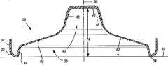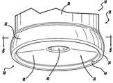 외주벽 또는 에지(44)는 접촉 링(34)과 반전 링(42) 사이의 연결부를 한정하며, 바람직하게는 대략 0.76mm에서 8.26mm 길이의 실질적으로 곧은 직립 벽이다.  67.06mm의 직경을 갖는 베이스 용기의 경우, 외주벽(44)은 대략 3.56mm에서 대략 3.68mm까지의 길이를 가지며, 127mm의 직경을 갖는 베이스 용기의 경우, 외주벽(44)은 대략 8.26mm의 길이를 가진다.  외주벽(44)은 대략 0~20°사이, 바람직하게는 15°의 중앙 길이방향 축(50)에 대하여 일반적으로 수직하다.  따라서 에지 또는 외주벽(44)은 중앙의 길이방향 축(50)에 정확히 평행할 필요는 없다.  외주벽 또는 에지(44)는 접촉 링(34)과 반전 링(42) 사이에서 별개로 식별될 수 있는 구조이다.  외주벽 또는 에지(44)는 접촉 링(34)와 반전 링(42) 사이의 연결부에 강도를 제공한다.  이 연결부는 기하학적으로 강성 구조를 형성하기 위해서일 뿐만 아니라 국부 강도를 최대화하기 위하여 급격히 이루어져야 한다.  그로 인한 국부적인 강도는 주름에 대한 저항을 증가시킨다.  67.06mm의 직경을 가지는 베이스 용기의 경우, 접촉 링(34)은 일반적으로 대략 0.25mm 내지 0.41mm의 벽 두께(68)를 가진다.  바람직하게, 벽 두께(68)는 반전 링(42)의 하부(58)의 벽 두께(66)와 적어도 같고, 더욱 바람직하게는 10% 이상이다.The outer circumferential wall or