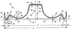 베이스(20)의 중앙부(36)가 가지는 부피량은 베이스(20)의 투영된 총 표면적과 비교하였을 때 베이스(20)의 중앙부(36)의 투영된 면적에 또한 의존한다.  용기(10)의 본체부(18)에 진공 패널 또는 핀치 그립을 제공할 필요성을 제거하기 위하여, 베이스(20)의 중앙부(36)에는 베이스(20)의 총 투영된 표면적의 약 55%, 바람직하게는 약 70%보다 큰 투영된 표면적이 제공된다.  도 5 및 7에 도시된 바와 같이, 베이스(20)를 통과하는 관련된 투영 선의 길이들은 A, B, C1 및 C2로 식별된다.  베이스(20)의 투영된 총 표면적(PSAA)은 다음의 방정식으로 정의된다.The volume of the
