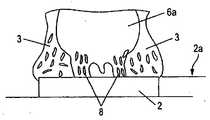 여기서, 범프(6*)의 하단부와 전극(2)의 표면(2a)과의 사이에 개재하는 플럭스(3)중의 금속분(8)은 플럭스(3)중에 배합된 상태대로, 즉 도 5a에 도시한 바와 같이 박편상의 코어부(8a)의 표면을 표면부(8b)가 덮는 상태에 있다. 그리고, 플럭스(3)중에는 랜덤한 자세로 금속분(8)이 다수 존재하기 때문에, 범프(6*)의 하단부와 전극(2)의 표면(2a)을 잇는 금속분(8)의 브리지가 높은 확률로 형성된다(도 4a에서 화살표 a로 나타낸 부분 참조).Here, the