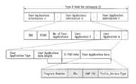 또한, 본 발명과 관련하여 두 번째 정보와 관련된 상기 유저 애플리케이션 필드를 살펴보면, 상기 SId와 SCId에 식별되는 채널에서 데이터를 디코딩하기 위해 사용되는 유저 애플리케이션을 식별하기 위한 유저 애플리케이션 타입(User Application Type) 필드, 상기 유저 애플리케이션 데이터의 길이 정보인 유저 애플리케이션 데이터 길이(), MSC 스트림 서비스 컴포넌트의 X-PAD 내에 실려오는 애플리케이션을 위한 X-PAD 필드와 본 발명과 관련된 해당 서비스에 대한 실제 정보인 유저 애플리케이션 데이터 필드가 있다.In addition, referring to the user application field related to the second information in connection with the present invention, a user application type field for identifying a user application used to decode data in a channel identified in the SId and SCId A user application data length () which is length information of the user application data, an X-PAD field for an application loaded in an X-PAD of an MSC stream service component, and a user application data field which is actual information about a corresponding service according to the present invention. There is.