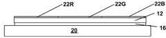 그 후, 제 1 릴리즈 시트 (14) 가 전기영동 매체 (12) 로부터 제거되고, 따라서, 이러한 매체의 평활한 표면이 노출되며, (도 3에서, 각각, 레드, 그린, 및 블루 컬러 스트라이프 (22R, 22G, 22B) 을 포함하는 것으로 간략하게 표시되어 있는) 컬러 필터 어레이는, 높은 정확도 잉크-젯 프린터를 사용하고 백플레인 (20) 상에 형성된 기준 마크들에 따라 시스템을 위치결정하여 이러한 평활한 표면상에 잉크젯 프린팅된다.     제조 환경에서, 이러한 단계는 용이하게 자동화된다.     이러한 기술이 사전-형성된 컬러 필터 어레이의 백플레인과의 약한 (delicate) 정렬을 회피함을 유의하며, 컬러 필터 어레이의 위치결정 및 정렬은 백플레인 (20) 그 자체상에 형성된 기준 마크들에 의해 제어된다.     기준 마크 그 자체는, 백플레인의 제조 동안 사용되는 패터닝 절차의 일부로서 높은 정확도로 용이하게 위치될 수 있다.Thereafter, the