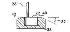 편향기 표면(22)은 도 2에 도시된 만곡형 상부 모서리(34) 및 도 3에 도시된 만곡형 모서리(36)와 같은 다른 모양을 가질 수 있다.  도 4 및 5에 도시된 바에 따르면, 편향기 표면(22)은 평탄부(40) 및 후퇴각으로 둘러싸인 폐쇄형 단부 공명튜브(38), 각상부{42,(도 4)} 또는 만곡부{44,(도 5)}를 또한 포함할 수 있다.  상기 공명 공동의 직경 및 깊이는 대체로 배출구(16)의 직경과 같을 수 있다.The