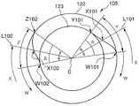 유효 나사부 (X) 는, 불완전 나사부 (Y) 의 중간의 유효 나사 시작점 (X1) 으로부터 완전 나사부 (W) 전체를 포함하여, 불완전 나사부 (Z) 의 중간의 유효 나사 종료점 (X2) 까지의 나사부이다.     유효 나사 시작점 (X1) 은, 도 8 에 나타내는 나사부 (3) 의 상면에서 보았을 때의, 단점 (Y1) 과 중심점 (C) 과 시작점 (W1) 에 의해 만들어지는 불완전 나사부 (Y) 의 협각 (∠α) 의 2 등분선 (L1) 과 불완전 나사부 (Y) 와의 교점이고, 유효 나사 종료점 (X2) 은, 종료점 (W2) 과 중심점 (C) 과 단점 (Z2) 에 의해 만들어지는 불완전 나사부 (Z) 의 협각 (∠β) 의 2 등분선 (L2) 과 불완전 나사부 (Z) 와의 교점이다.The effective thread part X is a thread part from the effective screw start point X1 of the middle of the incomplete thread part Y to the effective screw end point X2 of the middle of the incomplete thread part Z, including the whole thread part W whole. . The effective screw starting point X1 is the narrow angle of the incomplete thread part Y formed by the disadvantage Y1, the center point C, and the starting point W1 when seen from the upper surface of the threaded