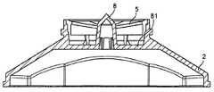 도 6, 7 및 8 은 본 발명의 제 2 모드에 따른 리필 가능한 다회용 컨테이너 (1) 를 나타낸다.     탱크 (2) 의 정상 개방된 단부를 폐쇄하는 수단 (4) 은 6 개의 가용성 텅 (5) 으로 이루어지며 각각의 텅은 한 부분 (51) 을 갖고 이 부분은  링 (53) 에 고정되며 이 링은 탱크 실린더 목부 (3) 내부에 끼워맞춤되고 한 부분 (52) 은 이 고정된 부분 (51) 맞은편에 있고 이 부분은 자유롭다.     이러한 수단 (4) 은 각각의 가요성 텅 (5) 의 자유 단부와 접촉하는 고정된 중앙 부분 (8) 을 또한 포함한다.     텅과 고정된 중앙 부분 (8) 은 정지시에 가요성 텅 (5) 이 중앙 부분 (8) 에 의지하게 되고 탱크 (2) 를 폐쇄하도록 상호 작용한다.     이러한 중앙 부분은 다수의 빔 (81) 에 의해 탱크에 고정될 수 있다.     수직 하방 배향된 압력이 텅 (5) 에 가해질 때, 모든 텅 (5) 의 가요성 단부 (52) 는 하방으로 그리고 중앙 부분 (8) 으로부터 멀어진다.     이는 텅 사이의 6 개의 틈과 중앙 부분 (8) 주위의 중앙 주변 틈을 발생시킨다.     하지만 이 주변 틈은 본 발명의 다른 모드에 의해 얻어질 수 있는 중앙 틈과 비교하면 작다.     그 결과, 도 1 ~ 도 5 의 실시형태의 분말의 유동은 단일 중대한 중심 유동이지만 텅 사이의 틈과 고정된 중앙 부분 (8) 주위의 틈을 통하여 흐르는 분말의 유동은 다수의 작은 유동으로 나누어진다.     중대한 경사가 급한 벌크 각을 발생시키는 입도를 갖는 분말 (미세 분말임) 에 대하여 제 2 모드의 실시형태가 바람직하다.6, 7 and 8 show a refillable multi-use container 1 according to a second mode of the invention. The means 4 for closing the normally open end of the