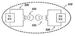 충전될 디바이스와 송신기 사이의 공중-경유 전력 송신을 사용하는 접근법들이 개발되고 있다. 일반적으로, 이들은 2개의 카테고리로 분류된다. 하나는, 방사된 전력을 수집하며 배터리를 충전시키기 위해 그것을 정류하는 충전될 디바이스 상의 수신 안테나와 송신 안테나 사이의 (또한, 원역장 (far-field) 방사로 지칭되는) 평면파 방사의 커플링에 기초한다. 일반적으로, 커플링 효율도를 개선시키기 위해 안테나들은 공진 길이를 갖는다. 이러한 접근법은, 전력 커플링이 안테나들 사이의 거리에 따라 신속하게 감소된다는 사실이 단점이다. 합당한 거리 (예를 들어, > 1 내지 2미터) 에 대해 그러한 충전은 어렵게 된다. 또한, 송신 시스템이 평면파를 방사하므로, 필터링을 통해 적절히 제어되지 않는다면, 의도치 않은 방사가 다른 시스템들과 간섭할 수 있다.Approaches are being developed that use air-via power transmission between the device to be charged and the transmitter. In general, they fall into two categories. One is based on the coupling of plane wave radiation (also referred to as far-field radiation) between the receiving antenna and the transmitting antenna on the device to be charged that collects radiated power and rectifies it to charge the battery. do. Generally, the antennas have a resonant length to improve the coupling efficiency. This approach is disadvantageous in that the power coupling is rapidly reduced with distance between the antennas. For a reasonable distance (eg> 1 to 2 meters) such filling becomes difficult. Also, if the transmission system emits a plane wave, it may not interfere with other systems if unintended radiation is not properly controlled through filtering.