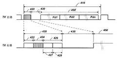도 15a 내지 15c는, 송신기와 수신기 사이의 통신을 위한 메시징 프로토콜을 도시한 타이밍도들이다.