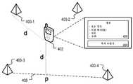 이동 장치(402)는, 예를 들어, 송신기(400-1)로부터 신호를 수신할 수 있다.  이 신호는 송신기(400-1)의 식별자를 포함할 수 있으며, 일부 구현예에서는, 송신기(400-1)의 위도 및 경도와 같은 다른 정보를 포함할 수 있다.  일부 구현예에서, 송신기의 위도 및 경도는 장치(402)에서 또는 원격적으로 서버에서 데이터베이스를 이용하여 결정될 수 있다.  위치 추정기(406)는, 예를 들어, 어느 정도의 불확실성과 오차를 갖고, 정보(406)를 이용하여 이동 장치(402)의 추정된 위치를 식별할 수 있다.The