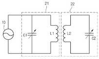 도 3은 본 발명의 일 실시예에 따른, 전력 소스(10)와 송신부(20)의 등가회로이다. 도 3에 도시된 바와 같이, 송신 코일(21)과 송신용 공진 코일(22)은 각각 소정 인덕턴스 값과 캐패시턴스 값을 갖는 인덕터(L1, L2)와 캐패시터(C1,C2)로 구성될 수 있다.