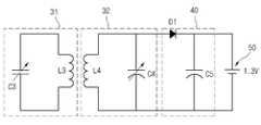 도 4에 도시된 바와 같이 수신용 공진 코일(31)과 수신 코일(32)은 각각 소정 인덕턴스 값과 캐패시턴스 값을 갖는 인덕터(L3,L4)와 캐패시터(C3,C4)로 구성될 수 있다. 평활 회로(40)는 다이오드(D1)와 평활 캐패시터(C5)로 구성될 수 있으며, 교류 전력을 직류 전력을 변환하여 출력한다. 부하(50)는 1.3V의 직류 전원으로 표시되어 있으나, 직류 전력을 필요로 하는 임의의 충전지 또는 장치일 수 있다.