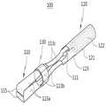 체결부(123)는 케이스(121)의 선단 양측으로부터 전방으로 각각 연장되고 각각의 연장된 단부에 내측 방향으로 체결돌기(123a)가 형성되어 클립 본체(110)의 기단부(111)가 체결돌기(123a) 내에 삽입되어 체결될 수 있다. 여기서, 케이 스(121)의 체결부(123)와 클립 본체(110)의 기단부(111)의 체결을 용이하게 하면서 체결 후 케이스(121)의 이탈 방지를 위해 체결돌기(123a)의 선단은 내측으로 경사지게 형성되고 체결돌기(123a)의 후단은 수직하게 형성되는 것이 바람직하다. 본 실시예에서 체결부(123)는 체결돌기(123a) 형태를 가지는 구성을 예시하였으나, 이에 한정되지 않고 다양한 체결 구조의 선택이 가능하다. 예를 들어, 체결부(123)는 클립 본체(110)의 기단부(111)에 암나사(미도시)를 형성하고 케이스(121)의 선단에 수나사(미도시)를 형성하여 암사나와 나사 체결되는 구성도 가능하다.The