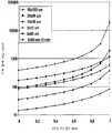 Vi는 1기압 압력 하에서의 기포의 초기 부피이다(즉, 이러한 도표를 생성하기 위하여 각각의 비아의 50%만이 기포로 충전됨). Pext= 0.2인 경우에 있어서, 유체에 대한 압력은 여전히 1기압이나, 액체의 벌크에 용해된 가스의 부분압은 단지 0.2 기압의 가스 압력과 평형을 이루는 압력과 동일하다. 예를 들어,탈가스된 유체 위의 가스의 압력이 1 기압인 동안 0.2 기압의 압력을 갖는 상기 유체가 표면을 흘러 넘치게 함으로써 트랩된 기포를 형성하는 것에 의해 위와 같은 조건이 성취될 수 있다. Pext= 3인 경우에 있어서, 액체에서 용해된 가스의 양이 1 기압의 압력과 평형을 이루는 압력과 동일하나, 액체 및 기포에 대한 압력은 3 기압 압력과 동일하다. 예를 들어, 대기-포화된(atmospheric-saturated) 액체가 표면을 흘러 넘치게 하고, 그 후 3 기압의 비아/액체/웨이퍼 위에 외부 압력을 가함으로써 트랩된 기포를 형성하는 것에 의해 위와 같은 조건이 성취될 수 있다.Vi is the initial volume of bubbles under 1 atmospheric pressure (i. E., Only 50% of each vial is filled with bubbles to produce this plot). In the case of Pext = 0.2, the pressure on the fluid is still equal to 1 atm, but the partial pressure of the gas dissolved in the bulk of the liquid is equal to the pressure equilibrating with a gas pressure of only 0.2 atm. For example, the above conditions can be achieved by forming trapped bubbles by allowing the fluid having a pressure of 0.2 atmospheres to overflow the surface while the pressure of the gas on the degassed fluid is 1 atm. In the case of Pext = 3, the amount of gas dissolved in the liquid equals the pressure which equilibrates with the pressure of 1 atm, but the pressure for liquid and air bubbles is equal to 3 atm. For example, the above conditions can be achieved by causing the atmospheric-saturated liquid to flood the surface and then trapped bubbles by applying external pressure to the 3-atmosphere via / liquid / wafer. .