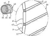 여기서 상기 가소성부재(s2)는 상기 핀과 핀을 부착시키도록 상기 핀(p)들 사이에 개재되도록 배치되는 것이 도시되어 있지만, 도 2와 같이 원통형의 가소성부재(s2) 외주에 상기 핀(p)을 배치하여 부착하는 것도 가능하다.Here, the plastic member s2 is disposed to be interposed between the pins p to attach the pin and the pin, but the pin p is formed on the outer circumference of the cylindrical plastic member s2 as shown in FIG. 2. It is also possible to arrange and attach).