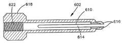 그러한 구성은 무-계단(step-less) 구성을 생성할 수 있다(즉, 봉과 홀딩 도구는 서로에 대해 그 어떤 각도로 위치될 수 있다). 몇몇 실시예에 있어서, 봉의 결합부는 봉의 결합부를 따라 소정의 간격으로 위치된 하나 또는 그 이상의 수납부들 또는 리세스들을 구비할 수 있다. 그러한 구성은 계단 구성을 초래할 수 있다(즉, 봉과 홀딩 도구는 서로에 대해 미리-설정 고정된 각도로 위치될 수 있다). 봉의 결합부가 단지 하나의 리세스를 가지는 경우의 실싱예에 있어서, 가늘고 긴 부재의 테이퍼부/팁이 리세스와 결합할 때, 봉의 축이 홀딩 도구의 축과 정렬될 수 있도록 리세스는 위치될 수 있다.Such a configuration can produce a step-less configuration (ie, the rod and holding tool can be positioned at any angle relative to each other). In some embodiments, the engagement portion of the rod may have one or more receptacles or recesses positioned at predetermined intervals along the engagement portion of the rod. Such a configuration can result in a staircase configuration (ie, the rods and holding tools can be positioned at a preset-set fixed angle with respect to each other). In a sealing example where the engagement portion of the rod has only one recess, when the tapered portion / tip of the elongate member engages the recess, the recess can be positioned so that the axis of the rod can be aligned with the axis of the holding tool. have.