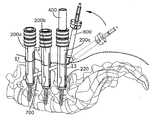 그 후, 가이드 와이어(미도시)는 절개부를 통해 척추뼈 속으로 삽입될 수 있다. 가이드 와이어가 척추뼈(예, 척추뼈의 척추경 속으로)에 부착될 수 있도록 외과수술용 망치(mallet) 또는 다른 충격 도구(미도시)는 가이드 와이어를 타격하기 위해 사용될 수 있다. 가이드 와이어는 다양한 장치 및/또는 임플란트를 환자 속으 로 그리고 척추 쪽으로 안내하기 위해 사용될 수 있다. 예를 들어, 가이드 와이어는 확장기(dilators), 삽입 가이드, 드릴 비트, 스크류드라이버, 및/또는 임플란트(예, 뼈 스크류)를 척추의 위치로 안내하는데 사용될 수 있다. 그러나, 본 명세서에서 설명된 그 어떤 장치들은 가이드 와이어 및/또는 가이드 와이어를 사용하지 않고 형성될 수 있는 척추를 향하는 통로들을 사용하지 않고 환자 속으로 삽입될 수 있음을 주목해야 한다.The guide wire (not shown) can then be inserted into the vertebrae through the incision. Surgical mallets or other impact tools (not shown) may be used to strike the guide wires such that the guide wires may be attached to the vertebrae (eg, into the pedicle of the vertebrae). Guide wires can be used to guide various devices and / or implants into and into the spine. For example, guide wires may be used to guide dilators, insertion guides, drill bits, screwdrivers, and / or implants (eg, bone screws) to the location of the spine. However, it should be noted that some of the devices described herein can be inserted into a patient without the use of guide wires and / or passages towards the spine that can be formed without using the guide wires.