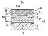 다음에, 유기 EL 소자(24)의 제작공정을 설명한다.  도 6에 나타내듯이, 지금까지 유기층(17)은 설명을 위해 하나의 층으로서 설명했으나, 실제로는 유기 EL 소자(24) 동작기구의 기능분리가 이루어지므로, 2층 이상의 다층구조로 된다.Next, the manufacturing process of the
