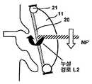 도 6은 이러한 프로세스가 전면 원점(frontal origin)의 웨이브 프런트(NF')에 대해 일어나는 것을 나타내며, 여기서 상호작용 프로세스가 가장 길어진다. 도 6a는 이어폰 케이싱(11)의 리딩 에지(leading edge)(전면 에지)의 웨이브 프런트(NF')의 도달을 나타내며, 여기서 누설 경로(L1)는 이어폰 아래에 있다. 웨이브(NF')가 이어폰을 진행하여 중간 위치에 도달할 때(도 6b), 진입 누설 경로가 이어폰 테두리(20) 둘레 및 아래에서 회절을 통해 일어난다. 웨이브 프런트(NF')가 이어폰(10)에서의 진행을 완료하고 후면(후방) 에지(도 6c)를 떠날 때, 웨이브 프런트는 이어폰 테두리(20) 둘레 및 아래 뒤쪽에서 회절되고, 따라서 이어폰(10)과 바깥쪽 귀 사이의 사운드 압력 레벨에 기여한다.Figure 6 shows that this process occurs for the wave front (NF ') of the frontal origin, where the interaction process is the longest. 6A shows the arrival of the wave front NF ′ of the leading edge (front edge) of the