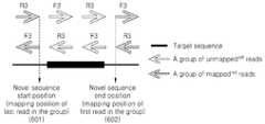 S460 단계에서 생성된 신규서열의 위치 및 타입을 예측한다(S470). 이때, 신규서열에 포함된 컨티그를 생성하는 데에 사용된 서열 조각쌍들의 서열조각 중 참조서열에 매핑된 매핑서열조각의 참조서열 상에서의 위치를 기초로 신규서열의 참조서열 상에서의 위치를 예측할 수 있다. 본 단계에서 신규서열의 위치 및 타입을 예측하는 구체적인 예는 도 6에 관한 설명에서 개시한다.The position and type of the new sequence generated in step S460 are predicted (S470). In this case, the position of the new sequence may be predicted based on the position on the reference sequence of the mapping sequence fragment mapped to the reference sequence among the sequence fragments of the pair of sequence fragments used to generate the contig included in the new sequence. Can be. A specific example of predicting the position and type of the new sequence in this step is disclosed in the description of FIG. 6.