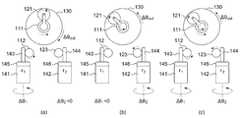 도 7의 (b)는 제 2 구동유닛(142)만을 구동시키고 제 1 구동유닛(141)은 정지한 생태를 개략적으로 나타낸다. 이를 참고하면, 제 2 구동유닛(142)이 일정각도() 회전하고, 제 1 구동유닛은 회전하지 않는다. 제 2 구동유닛(142)의 회전에 의해 유성기어(121)가 특정 방향으로 회전하게 되고 이에 의해 제 3 기어부(130)가 특정 출력각도()를 갖는다.7B schematically shows an ecology in which only the