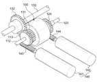 제 1 기어부(110) 및 제 2 기어부(120)는 서로 다른 구동원(140)으로부터 각각의 구동력을 전달 받는 것이 바람직하다. 이때 구동원은 제 1 구동유닛(141) 및 제 2 구동유닛(142)를 포함할 수 있다. 이러한 구동원(140)은 구동력을 전달할 수 있는 모터, 펌프, 실린더 등 다양한 구동력 전달 유닛이 사용될 수 있다. 이하 실시예 에서는 모터가 사용되는 것으로 예시한다.It is preferable that the