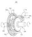 이하는 선기어(111)를 포함하는 제 1 기어부(110) 및 유성기어(121)와 캐리어(122)를 포함하는 제 2 기어부(120)가 입력파트가 되고 링기어로 예시되는 제 3 기어부(130)가 출력파트가 되는 예를 기준으로 설명한다.The following is a third gear, which is an input part and includes a