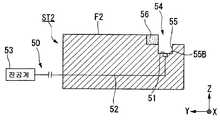 계측 스테이지 (ST2) 는, 기판 스테이지 (ST1) 의 오버행부 (H1) 에 대응하는 오목부 (54) 를 가지고 있다.     오목부 (54) 는, 계측 스테이지 (ST2) 의 상면 중, 기판 스테이지 (ST1) 와 근접 또는 접촉하는 영역 (-Y 측의 영역) 에 형성되어 있으며, 계측 스테이지 (ST2) 의 상면 (F2) 의 -Y 측의 일부를 절결하여 형성되어 있다.     그리고 계측 스테이지 (ST2) 의 오목부 (54) 의 내측에는, X 축 방향으로 연장되는 홈부 (55) 가 형성되어 있다.     회수구 (51) 는 오목부 (54) 에 형성된 홈부 (55) 의 내측에 형성되어 있다.     도 5 에 나타내는 바와 같이, 회수구 (51) 는 평면에서 보았을 때 거의 원형상이며, 홈부 (55) 의 바닥면 (55B) 에 있어서, X 축 방향으로 복수 개가 나란히 형성되어 있다.     그리고, 그들 복수의 회수구 (51) 의 각각이, 유로 (52) 를 통하여 진공계 (53) 에 접속되어 있다.     여기서, 홈부 (55) 의 바닥면 (55B) 은 +Z 측을 향한 평면이다.The measurement stage ST2 has the recessed
