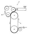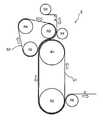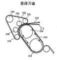 벨트 형상형 (234) 은, 상술한 특허 문헌 1 에 기재된 벨트 형상형 (103) 과 동일하게 하여, 스틸롤 (250, 252) 의 회전에 의해 스틸롤 (250) 및 스틸롤 (252) 주위를 회전 운동한다.     또, 벨트 (282) 는 상기와 같이 벨트 형상형 (234) 에 압압되고 있기 때문에 벨트 형상형 (234) 의 회전 운동에 맞춰 보조롤 (258) 주위를 회전 운동한다.The