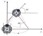 (여기서, dx와 dy는 x좌표와 y좌표에서 원하는 위치와 로봇(100)과의 거리차이고, θd는 목표점과 이송로봇(100)을 잇는 선각도이고, θr은 이송로봇(100)의 현재 방향각을 의미한다.(Where, dx and dy are the distance between the desired position and the