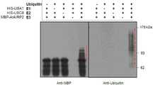 도 3은 AtAIRP2 단백질의 효소 활성을 분석한 결과를 나타낸 그림이다.   AtAIRP2 단백질들에 MBP(maltose binding protein)를 붙인 다음 오토-유비퀴티네이션을 수행한 것으로, HIS-UBA1, HIS-UBC8, 유비퀴틴 및 MBP-AtAIRP2를 1시간 동안 30℃에서 배양 후 단백질 변화를 확인하기 위해서 MBP 및 유비퀴틴 항체를 이용하여 웨스턴 블롯 분석을 실시하였다.   AtAIRP2 단백질의 분자량이 증가됨을 MBP 항체를 이용한 웨스턴 블롯 분석을 통해 알 수 있었고, 이들의 증가가 유비퀴틴에 의한 것인지를 확인하기 위해 유비퀴틴 항체를 사용하였다.   이 결과, AtAIRP2 단백질은 유비퀴틴 단백질을 붙여주는 E3 유비퀴틴 라이게이즈의 효소활성 능력을 가짐을 알 수 있었다.