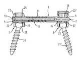 양단부에 2개의 클램프를 구비한 기다란 코일 스프링을 구비하는 가요성 커플러 및 이 가요성 커플러를 관통하여 연장함과 동시에 상기 클램프에 고정된 가요성 케이블 또는 가요성 봉이 포함되어 있다. 이 관절 고정장치는 구성이 복잡하고 부피가 크므로 척추에 사용하기에 부적합하다.A flexible coupler having an elongated coil spring with two clamps at both ends and a flexible cable or a flexible rod extending through the flexible coupler and fixed to the clamp are included. This joint fixation is not suitable for use in the spine because of its complex configuration and bulkiness.