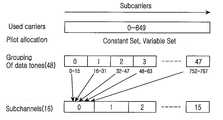 여기서, 상기 그룹의 수는 부채널을 구성하는 반송파의 수를 반송파 집단수로 나눈 수로 각각의 그룹에서 상기 반송파 집단수 만큼의 인접한 부반송파를 선택하여 하나의 부채널을 구성하도록 나눈다.Here, the number of groups is divided by the number of carriers constituting the subchannels divided by the number of carrier groups and divided to form one subchannel by selecting adjacent subcarriers as many as the number of carrier groups in each group.