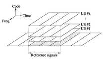 주파수 영역의 기준신호 확산방식은 PN(Pseudo-Noise), 직교부호, 또는 상관특성이 우수한 특정 시퀀스(e.g. CAZAC 시퀀스)를 직접적으로 주파수 영역으로 확산하여 전송하는 방식으로 독립적인 신호 처리과정을 수행할 수 있다. 하지만, 제어신호의 확산이 시간 영역으로 한정되거나 이에 우선 순위(e.g. 단말 구분 또는 셀간 간섭 평준화 등)를 두고 있는 경우, 나아가 FDM(Frequency Division Multiplexing) 방식을 통한 단말 또는 셀간 구분을 수행하고 있는 경우, 기준신호 구조와 제어신호 전송방식이 상이하여 시간-주파수 영역의 상이한 확산 부호를 적 용해야 하고, 제어신호 전송효율을 제한하는 문제가 발생한다. 예를 들면, 동일한 기준신호 구조로 주파수 영역에서 확산 부호를 직접 매핑하는 경우 기준신호용 무선자원 할당이 증가할수록 시간 영역의 제어신호 확산의 SF는 감소하여, 단말의 수용 능력에 직접적인 영향을 준다. 나아가 셀간 간섭에도 영향을 주게 된다. 결국, 시간 영역의 CDM 형태의 제어신호 전송에 있어서는 기준신호 전송을 위해 독립된 주파수 영역 확산 구조보다는 전송되는 제어신호와의 효과적인 결합방식에 대한 제안이 필요하다.In the frequency domain reference signal spreading method, a PN (Pseudo-Noise), an orthogonal code, or a specific sequence (eg, a CAZAC sequence) having excellent correlation characteristics is directly spread and transmitted in the frequency domain to perform independent signal processing. Can be. However, when the spread of the control signal is limited to the time domain or has priority (eg, terminal division or inter-cell interference equalization), and further, when performing division between terminals or cells through the frequency division multiplexing (FDM) scheme, Since the reference signal structure and the control signal transmission method are different, it is necessary to apply different spreading codes in the time-frequency domain, and there is a problem of limiting the control signal transmission efficiency. For example, in the case of directly mapping spreading codes in the frequency domain with the same reference signal structure, as the radio resource allocation for the reference signal increases, SF of spreading control signals in the time domain decreases, thereby directly affecting the capacity of the terminal. It also affects inter-cell interference. As a result, in the transmission of control signals in the time domain CDM type, it is necessary to propose an effective coupling method with the transmitted control signals rather than an independent frequency domain spreading structure for transmitting the reference signals.