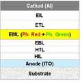 경우에 따라, 상기 제 1 정공 수송층과 적색/녹색 인광 발광층 사이에 여기자 저지층을 더 구비할 수도 있으며, 혹은 상기 제 1 정공 수송층을 적색/녹색 인광 발광층의 여기 상태 에너지보다 0.01~0.4eV 높은 값을 갖는 제 2 정공 수송층으로 대체할 수 있다.In some cases, an exciton blocking layer may be further provided between the first hole transport layer and the red / green phosphorescent layer, or the first hole transport layer is 0.01 to 0.4 eV higher than the excited state energy of the red / green phosphorescent layer. It can be replaced with a second hole transport layer having a.