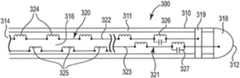 각각의 회로(320, 321)는 가장 근위측 공진 LC 필터(326)에서 시작하여 원위 단부로부터 근위 단부까지 구성되는 제 1 회로(320)를 갖고 개별적으로 구성된다.  따라서, 복수의 회로를 가정하면, 다음의 가장 원위측 공진 LC 필터(327)와 관련된 전극 와이어는 가장 근위측인 공진 LC 필터 위에 통과한다.  공진 LC 필터 아래에서 전극 와이어를 통과하는 것은 그 공진에 악영향을 미칠 수 있다.  다른 한편으로는, 비공진 인덕터 아래에서 와이어를 통과하는 것은 그 성능에 악영향을 미치지 않을 것이다.  따라서, 예시적인 공진 LC 필터(326)는 3개의 층(335, 336, 337)을 형성하기 위해 전극 와이어(322)의 적층에 의해 구성된다.  내부층으로부터 외부층까지의 턴의 비는 대략 3:2:1일 수 있어 공진 LC 필터의 일정한 물리적 기하학적 형상을 초래한다.  공진 LC 필터를 생성하는 것은 당 기술 분야의 숙련자들에게 명백하고, 다수의 실시예가 본 발명의 요건을 만족시킬 수 있다.  예를 들어, 커패시터는 인덕터와 병렬로 배치될 수 있다.  다른 유형의 공진 LC 필터가 또한 본 발명의 범주 내에 있을 수 있다.Each