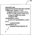 다른 실시예에서, 적어도 하나의 미디어 세그먼트는 그 특정 미디어 세그먼트와 관련있는 타임 매핑 프레그먼트를 포함할 수 있는데, 예를 들면 타임 매핑 정보는 미디어 콘텐츠 그자체의 일부로서 전달될 수 있다.  예를 들어 표 2에 도시된 바와 같이, 타임 매핑 정보를 운송하는 새 "box"를 도입할 수 있다.  표 2에서, 타임 매핑 정보에 대응한 박스는 "stif"(미디어 세그먼트 타이밍 정보)로 레벨링된다.  "stif" 박스는 표 2에 도시된 바와 같이 예를 들어 각 M번째 무비 프레그먼트 앞에 파일에서 임의 위치에 삽입될 수 있다.  도 7은 "stif" 박스를 정의할 수 있는 방법의 예(280)를 제공한다.  표 2 및 도 7을 참조하여, "time_point"는 따라서 후속한 무비 프레그먼트의 미디어 콘텐츠에 대응할 수 있다.  이런 식으로, 타임 매핑 프레그먼트는 다운로드된 미디어 세그먼트를 이미 제공받았으므로, 클라이언트 디바이스는 네트워크 위치로부터 적절한 타임 매핑 프레그먼트를 검색할 필요가 없다.  도 5를 참조하면, 예를 들어 지속기간이 타임 매핑 프레그먼트 1의 지속기간을 초과하지 않으므로, 미디어 세그먼트 1(1)는 타임 매핑 프레그먼트 1의 지속기간을 포함할 수 있고, 반면에 미디어 세그먼트 1(R)은 타임 매핑 프레그먼트 1과 타임 매핑 프레그먼트 2를 포함할 수 있다.