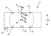 본 발명의 실시예들에서, 하나 또는 그 이상의 가속도계들이, 도 2에 도시된 것과 같이, 차량 (1)의 중력 중심 (6)에 또는 그 가까이에 또한 제공될 수 있을 것 이며, 상기 차량의 전방 이동의 통상의 방향에 평행한 방향으로 그리고 수직인 방향으로의 상기 차량의 가속도를 다시 탐지할 수 있을 것이다. y1은 상기 차량 (1)의 중력 중심 (6)과 왼쪽 또는 오른쪽 B 필러 (3) 사이의 거리이다.In embodiments of the invention, one or more accelerometers may also be provided at or near the
