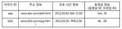 도 3은 본 발명에 의한 캐시 테이블의 또 다른 일예를 나타낸 것으로서 이미지 관련 데이터가 주소 정보와 유효 시간 정보로 구성된 경우의 예를 나타낸 것이다. 도 3의 캐시 테이블은 도 2와 비교할 때 이미지 관련 데이터로서 유효 시간 정보를 더 포함한다는 점에서 차이가 있다. 도 3을 참조하면, 이미지 식별자(ID) "aaa"는 "2012.05.02.AM 11:00"라는 유효 시간 정보를 가지며 이는 해당 시간까지 해당 이미지 식별자(ID)가 해당 주소 정보에서 유효하다는 것을 의미하는데 이는 결국 해당 주소 정보 "www.abc.com/def.html"이라는 전자 문서가 해당 시간까지만 유효하다는 것을 의미한다.FIG. 3 shows another example of the cache table according to the present invention, in which the image-related data is composed of address information and valid time information. The cache table of FIG. 3 differs from FIG. 2 in that it further includes valid time information as image related data. Referring to FIG. 3, the image identifier (ID) "aaa" has valid time information "2012.05.02.AM 11:00", which means that the image identifier (ID) This means that the electronic document with the address information "www.abc.com/def.html" is only valid until that time.