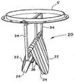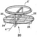 판 부재 또는 플랩 밸브의 또 다른 실시예(20')가 도 12 내지 도 15에 도시된다.  도시된 바와 같이, 판 부재(20')는 복수의 핀형 또는 삼각형 섹션(22')을 포함한다.  각각의 삼각형(22')의 베이스는 각각의 수평 축선(H')에 대한 피봇 운동을 위해 장착된다(예를 들면, 도 15에 도시된 바와 같이 원형 링(32)의 하부 상에 힌지(30)에 의해).  이어서 인접한 섹션(22')은 서로 교차하는 인접한 축선(H')(도 12 및 도 15)에 대해 피봇한다.  섹션(22')은 플로트(24)를 가지며 다른 제한 기구에 의해 또는 링(32)과 접촉하는 섹션(22')의 베이스 또는 힌지(30)에 의해 도 14의 개방 위치를 넘어 서로로부터 이격하여 하방으로 또는 도 12의 수평 위치를 넘어 상방으로 이동하는 것을 제한할 수 있다.  차례로 링(32)은 레그(34) 또는 다른 기구에 으해 도 8의 바닥 호스 부분(5') 아래 지지된다.Another embodiment 20 'of a plate member or flap valve is shown in Figures 12-15. As shown, the plate member 20 'includes a plurality of pin-like or triangular sections 22'. The base of each triangle 22 'is mounted for pivotal movement with respect to each horizontal axis H' (for example, a hinge 30 (see FIG. 15) on the lower portion of the circular ring 32 ). The adjacent sections 22 'are then pivoted relative to an adjacent axis H' (Figures 12 and 15) that intersect with each other. The section 22'has a