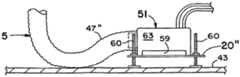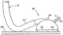 아마도 도 22 및 도 29에 가장 잘 도시되고 도 22 내지 29의 양 장치에서, 하나 또는 그 이상의 공기 또는 환기 구멍(65)은 유입 장치(51) 내에 포획되는 소정의 공기 또는 다른 가스가 탱크 물 내로 상방으로 누출되도록 하기 위해 제공도는 것이 바람직하다.  도시된 바와 같이 환기 구멍(65)은 높으며 바람직하게는 유입 장치(51)의 가장 높은 지점에 있다.  이러한 방식으로, 환기 구멍(65)은 공기 또는 가스 포켓이 개선되는 것을 방지하며 그렇지 않으면 탱크 플로어(43)로부터 유입 장치(51)를 팁 또는 리프팅하는 힘이 생성될 수 있다.  도 22 및 도 28에 가장 잘 도시되고 도 22 내지 도 29의 양 장치에서, 호스(5)의 메인 바디의 하부(47")의 부분은 바람직하게는 탱크 플로어(43)에 배치된다.  탱크 내의 물 레벨이 상승 및 하강할 때, 반지름방향으로 연장하는 하부(47")의 길이가 대응하여 짧아지고 길어진다.  이어서 탱크 플로어(43) 및 부유 플랫폼(3)의 하부 지점에 인접한 주요 고정부는 따라서 도 22의 전체 구성을 유지하도록 수면(6) 상에 수평으로 표류한다. 22 and 29, one or more air or